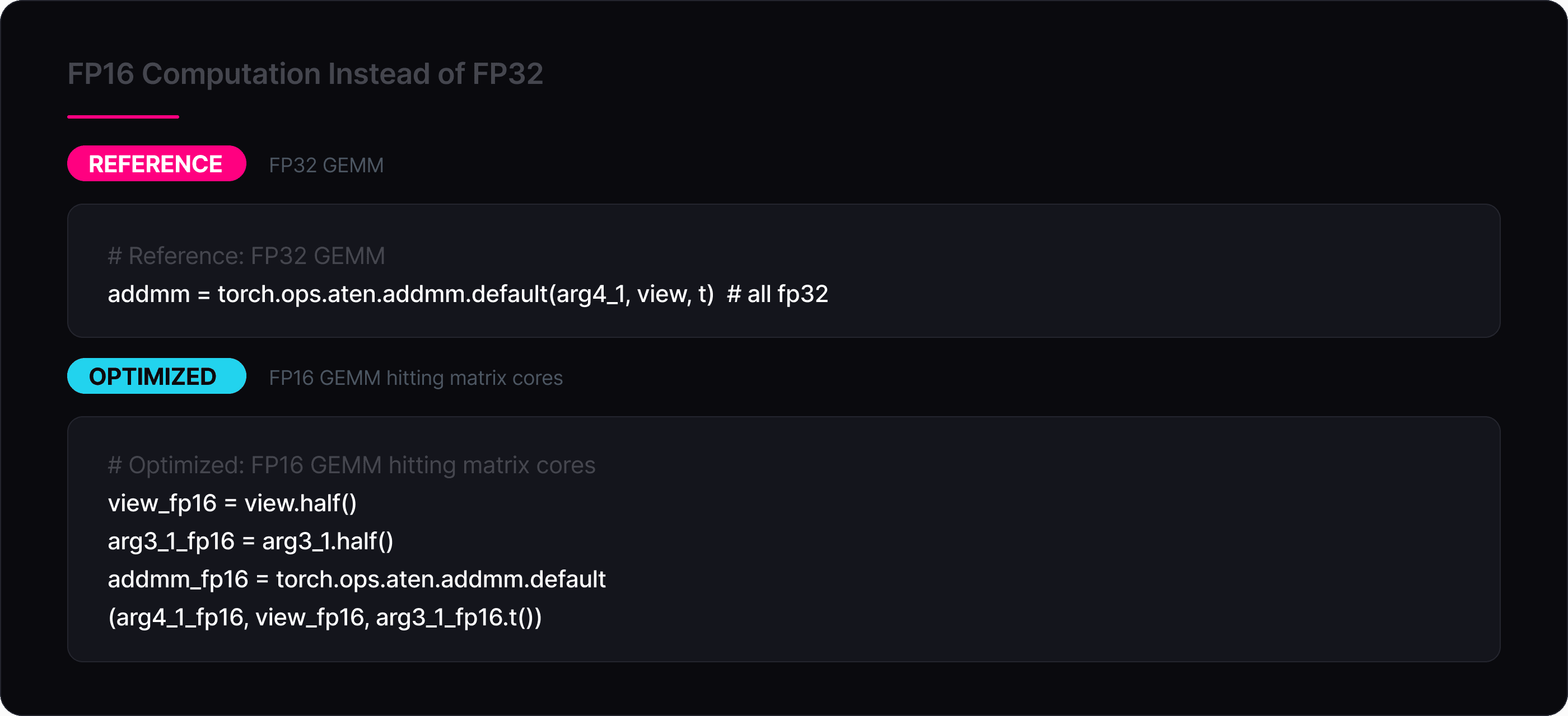 Since the three GEMMs (QKV projection 768→2304, output projection 768→768, FFN 768→3072 and 3072→768) dominate the compute budget of a transformer block, running them in FP16 is a big source of speedup. The optimized kernel explicitly casts weights and activations to FP16 before each addmm: