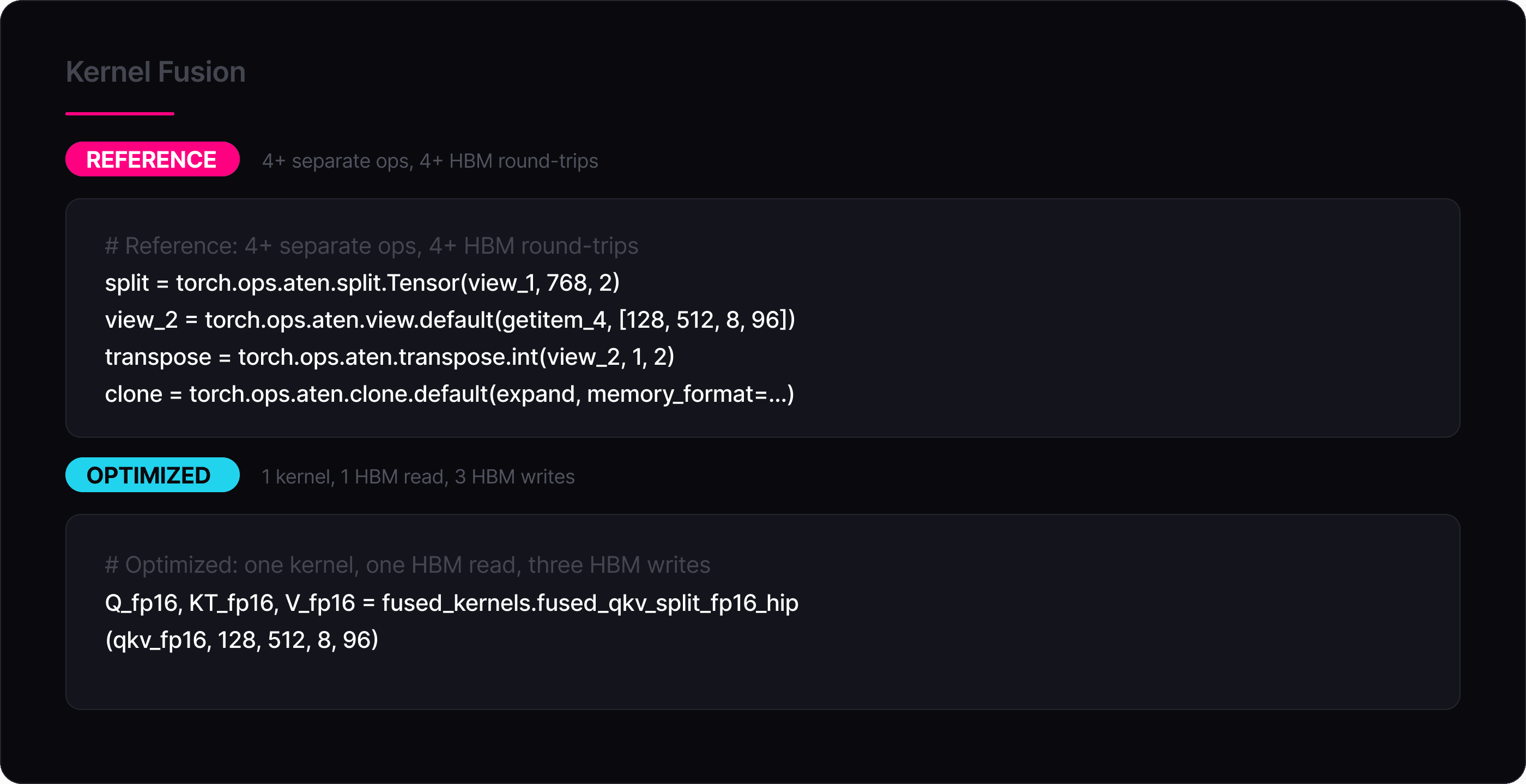 The same principle applies to the softmax (which fuses mul + masked_fill + softmax into one pass) and the residual additions (which fuse fp16→fp32 cast + add into one pass). Fewer kernel launches also means less HIP/CUDA runtime overhead and fewer global synchronization points between ops.